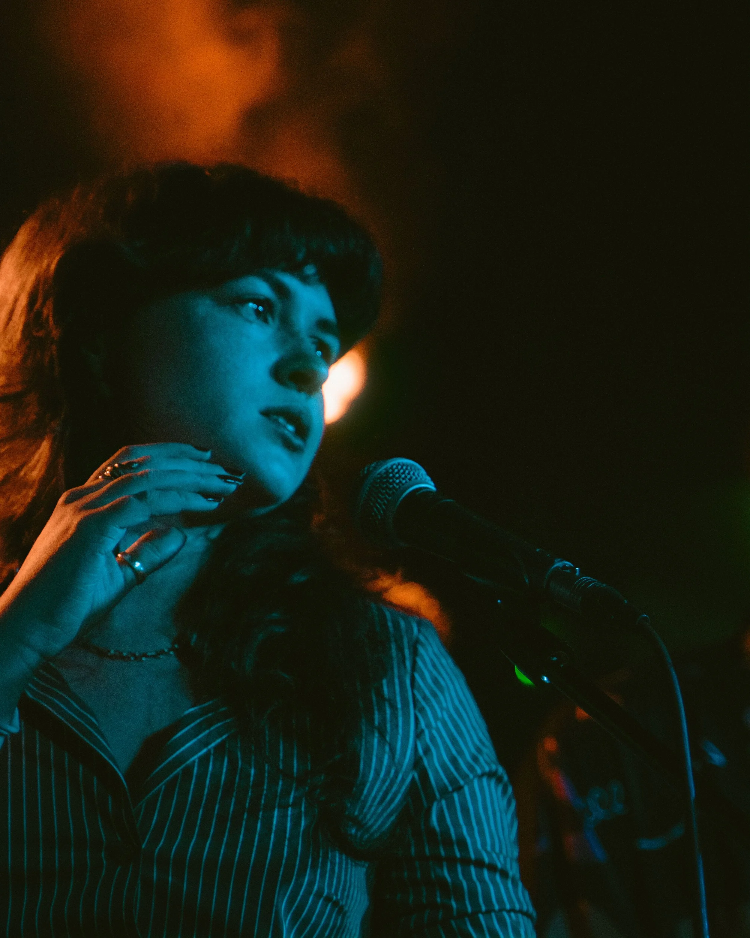 A woman singing passionately into a microphone on stage with dramatic orange and blue lighting.